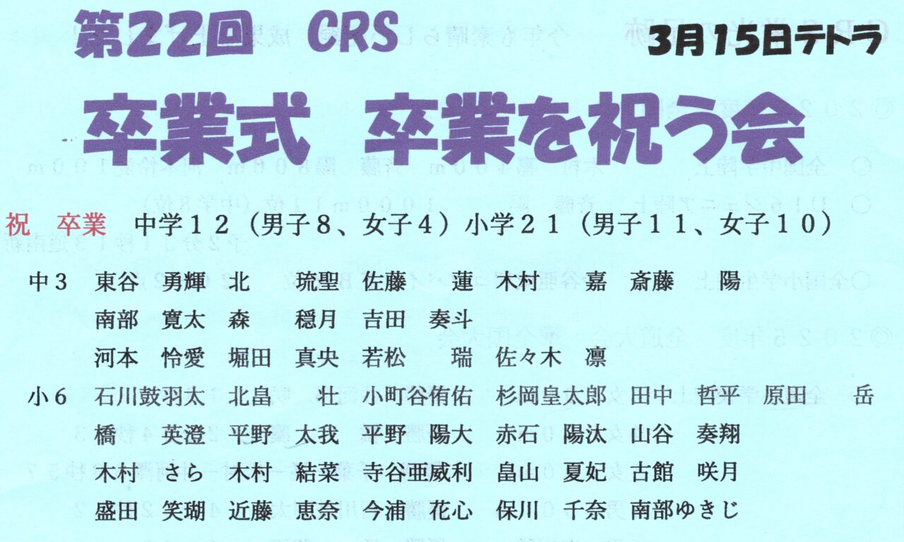3月15日(日)12時から、ホテル「テトラ」で卒業式と卒業を祝う会が実施されました。今年度の卒業生は、下記の通り、小学生21名、中学生12名。インフルエンザ等で出席できなかった生徒が数名いましたが、コーチの方々の参加をいただきながら、式は厳粛に、祝う会は和やかに行われました。卒業生のみなさん、卒業おめでとうございます。中学生や高校生での更なる活躍を祈念しています。※保護者・コーチの皆様、式と会の諸準備お疲れ様でした。